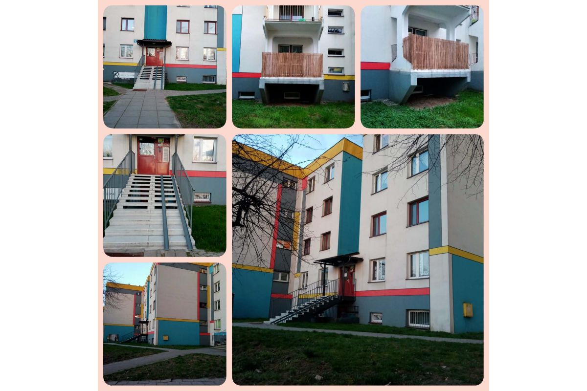 Parking : przestrzeń do parkowania przed wejściem do bloku.